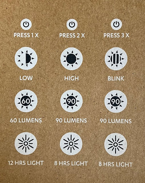 [Brightness] High/100 lumens, Medium/20 lumens, Low/10 lumens, Flashing mode