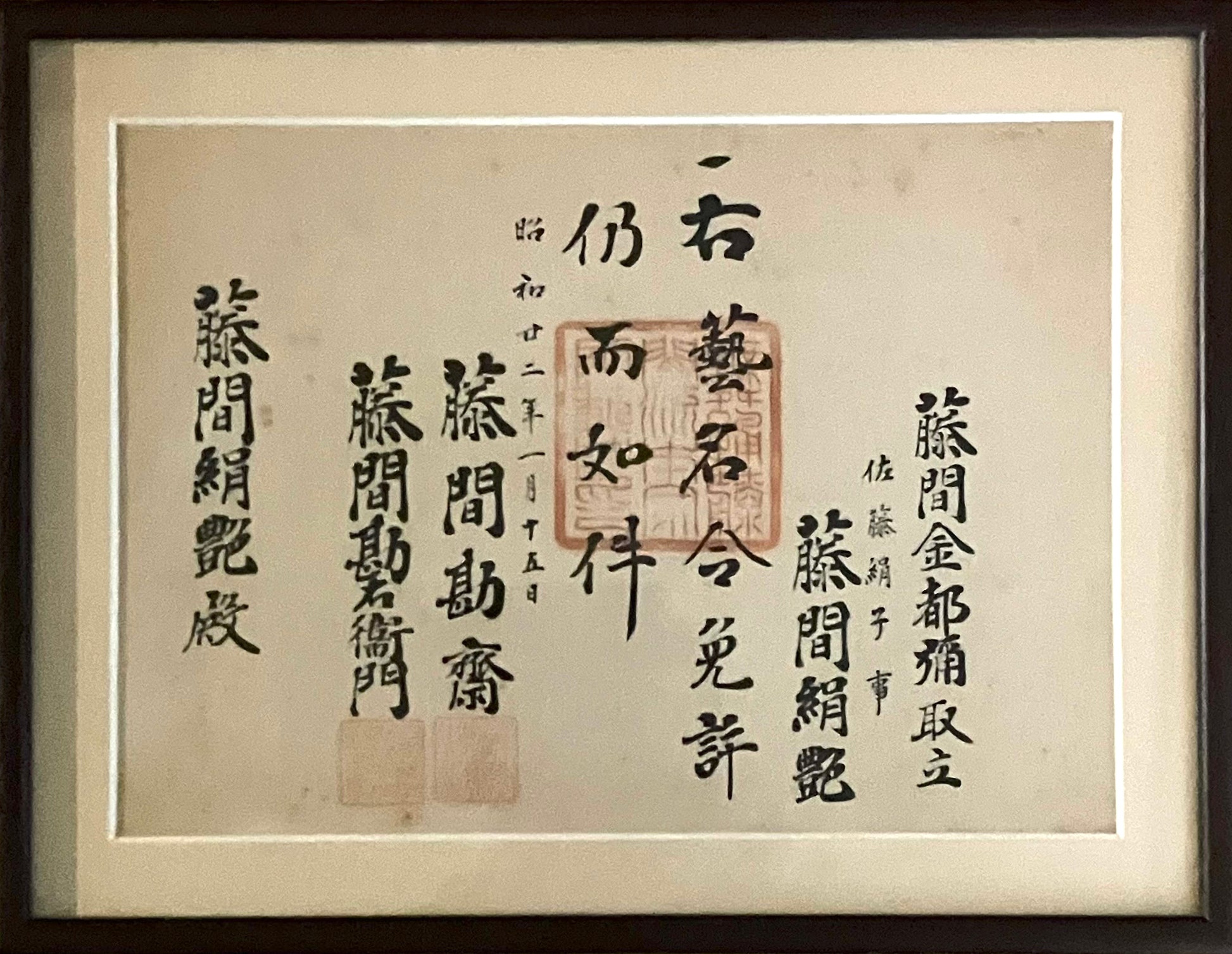 Certificate given to newly accredited master dancer, Kinutsuya Fujima, signed by Kansai Fujima and Kanemon Fujima in 1947.