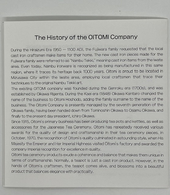 Oitomi is a long-established & leading manufacturer of Nambu ironware founded in 1848.